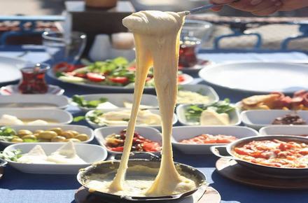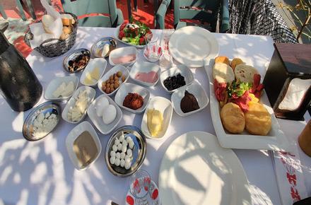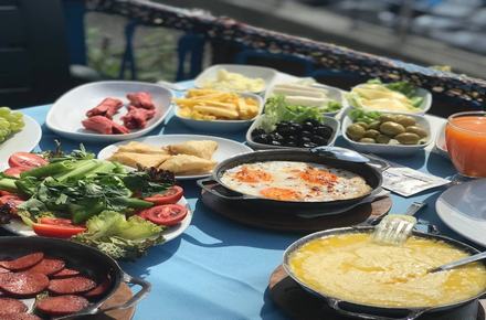 Menemen, Yumurtalı Ekmek ,Sosis Tava,Patates Kızartması,Muska veya Sigara Böreği,Şakşuka (Patlıcan Kızartması),Sıcak Köy Ekmeği (Bazlama) veya,Mısır Ekmeği ,Örgü peyniri,Kaşar peyniri,Beyaz peynir,Erzincan Tulum Peyniri,Yeşil Ege Zeytini,Siyah Ege Zeytini,Bal,Kaymak,Pekmez,Tahin,Ayva Reçeli,Havuç reçeli, Kabak Reçeli,Karışık Reçel,Kars Tereyağı,Domates Söğüş,Bahçe Biberi, Maydanoz Söğüş,Salatalık Söğüş,Salam,