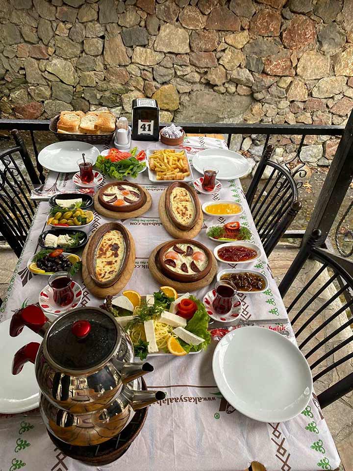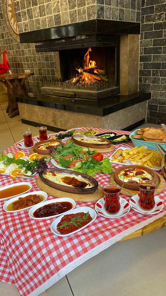 Kiremitte Eritme Köy Peyniri, Kiremitte Sucuklu Yumurta,Patates Kızartması, Sigara Böreği, Domates Salatalık Söğüş, Zeytin, Yeşil Zeytin, Ev Reçeli, Tereyağ, Kızarmış Ekmek, Bal, Kaymak, Acuka, Beyaz Peynir, Kaşar Peyniri, otlu lor; Demlik Çay.