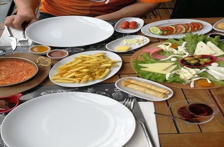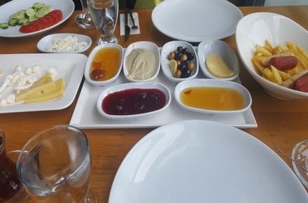 Sigara Böreği,Patates Tava,Söğüş,Sucuklu Yumurta veya Sahanda Yumurta veya Menemen, Pişi,Kızartılmış Çeri,Siyah Zeytin,Yeşil Zeytin,Beyaz Peynir,Ezine Peyniri,Tulum Peyniri,Kaşar Peyniri,Çubuk Peynir,Misket Peynir,Tereyağ,Bal,Nutella,Kayısı,Kayısı Receli,Vısne Receli,Çilek Receli,Sosis,Salam,Domates,Biber ,Sınırsız Çay Bulunmaktadır….