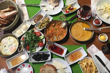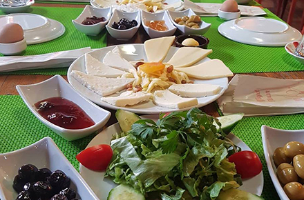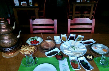 Sahanda yumurta, Domates soslu biber kızartması, Beyaz Peynir, Kaşar Peyniri, Örgü Peynir, İzmir Tulum Peyniri, Çeçil Peyniri, Siyah zeytin, Yeşil zeytin, Tereyağ, Bal, Bogurtlen recelli kaymak, Çilek reçeli, Tahin pekmez, Acuka, Demlik’de Çay Bulunmaktadır…