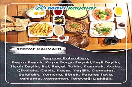 Beyaz Peynir, Örgü Peyniri, Kaşar, Bal, Reçel 3 Çeşit, Yeşil Zeytin, Siyah Zeytin, Tereyağı, Acuka, Şokella, Domates, Biber, Salatalık, Yeşillik, Yumurta, Mıhlama, Patates Kızartması, Sigara Böreği, 1 Demlik Çay bulunmaktadır.